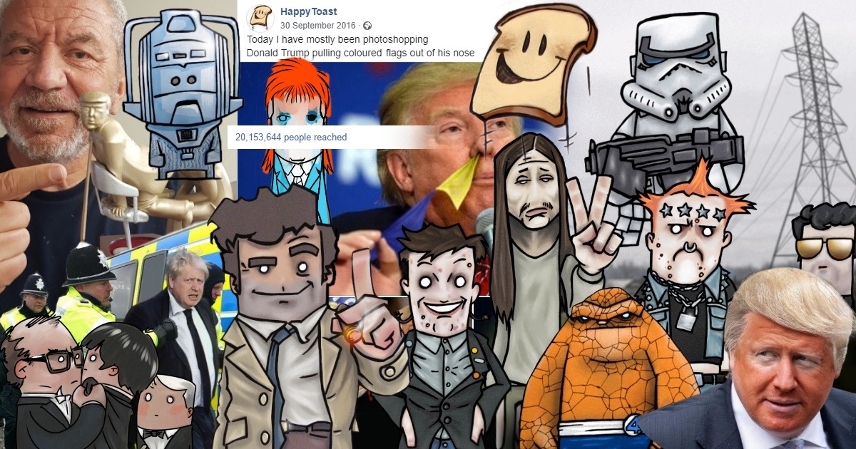 HappyToast is one guy who does drawings and photoshops and animations and writes funny stuff. He’s been doing it for decades, which is why he’s so tired and grumpy. His work has appeared all over the world in print and on TV, for everyone from big name companies to nice, normal people.